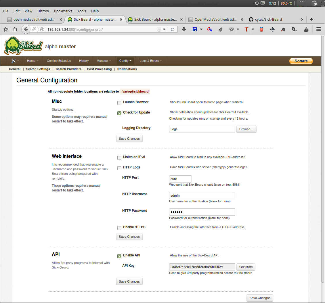 System > Plugins > openmediavault-sickbeard 1.0.10 (check) + Install